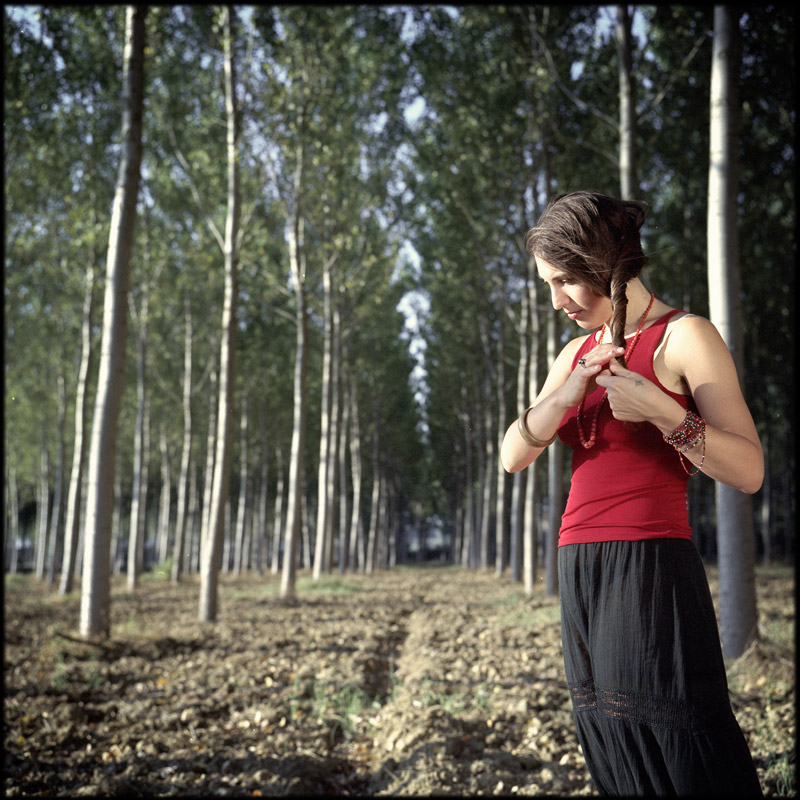 è mooolto bella!!!inannzittutto l'effetto della filiera di alberi..lei messa nella medesima posizione...quel gesto che fa molto dea della caccia nel bosco!!!!belle!!!