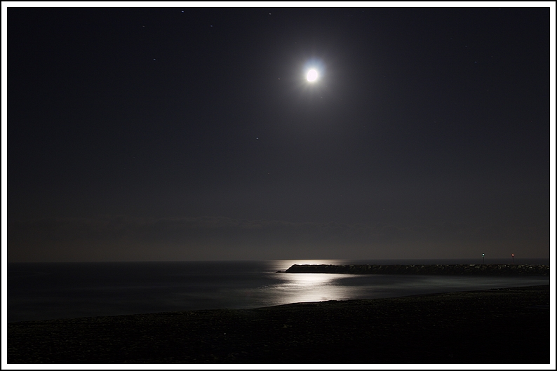 una bella luna si specchia nel mare, monto la macchina sul cavalletto e provo un'esposizione lunga