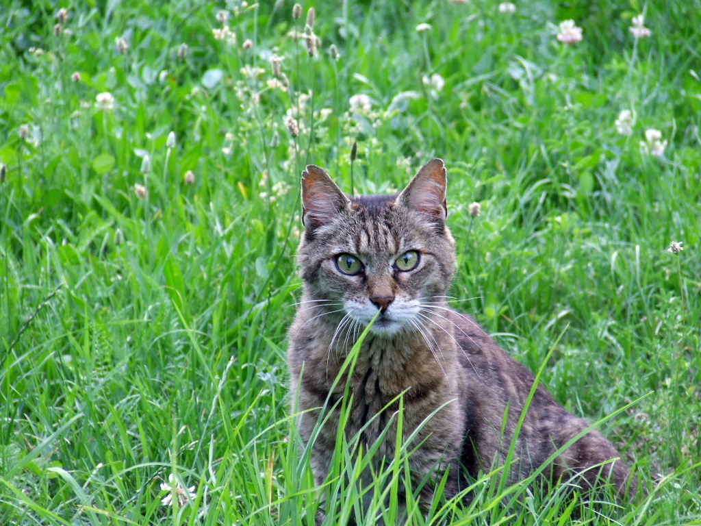 Avrei tagliato una buona parte dell'erba e avrei concentrato l'immagine sul gatto che ha uno sguardo molto concentrato.
