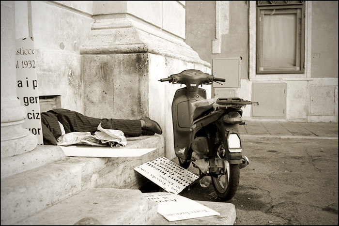 L'abbigliamento dell'uomo eccessivamente elegante e il suo giaciglio fanno decisamente a pugni.......