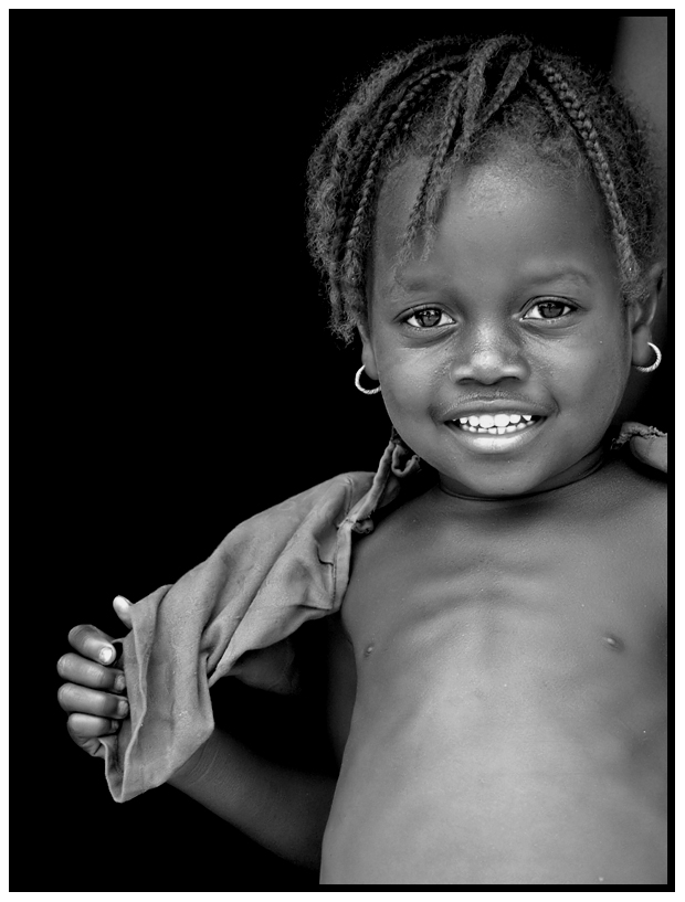 quelle pelli levigate, queste iridi splendenti che risaltano magnificamente sulla pelle scura e contro lo sfondo nero.... portano in se' una allegria spontanea che non vorremmo mai vedere spegnersi.... Il contrasto che conosciamo fra il loro tenore di vita e la apparente naturale giovialità.... rende ancora più forte la commozione.... Che anche con il piccolo aiuto delle adozioni a distanza il futuro di questi bimbi sia in positivo........e mai nero come la oscurità densa del fondale di questa fotografia.