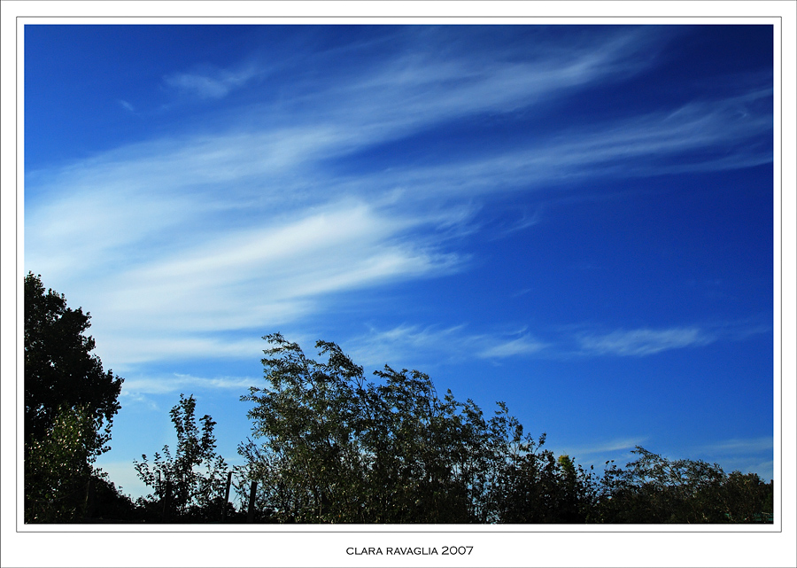 Bellissima immagine in cui le geometrie dele nubi su uno splendido sfondo blu, si uniscono ai rami degli alberi che mostrano tutta la dinamicità dovuta allo spirare del vento...