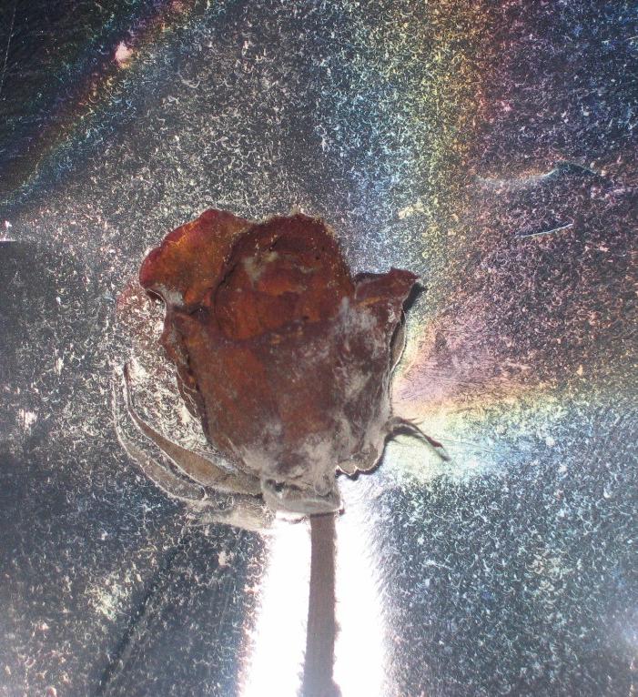Questa foto è frutto del caso: è una delle prime che ho fatto, e ancora non avevo la 350D; in pratica ho preso una rosa, di quelle che trovi dal fioraio solo che per una serie di motivi (mi ero lasciato con quella che era la mia ragazza) è rimasta due mesi buttata da una parte al buio; quando l'ho trovata era tutta ammuffita, ho aperto la confezione lasciando la carta argentata sotto e il flash ha creato l'effetto della luce che vedi! Che te ne pare? Credo sia in assoluto la foto meno ragionata che abbia mai fatto!