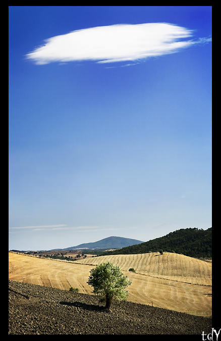 Molto bella,anche la luce così dura non infastidisce. Buona la resa dei colori ,l'inserimento della nuvoletta di Fantozzi è veramente una chicca. Unico appunto sulla compo,decisamente statica,che vede lo sviluppo verticale passare tutto sulla stessa linea centrale ( albero-cima del monte-nuvola). Un inquadratura di più ampio respiro avrebbe permesso di decentrare e,forse,regalato qualche emozione in più......