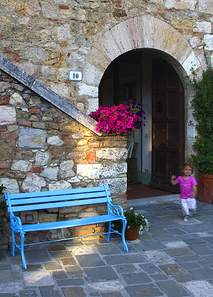 l'occhio è rapito dalla diagonale delle scale che finisce sul rosa delle petunie per continuare e terminare sulla bambina e sul colore della sua maglietta ...