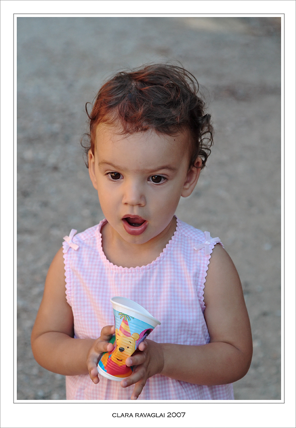 Qui si condensa, in poche tracce, un racconto; il cortometraggio di una festa che leggiamo nel bicchiere di Winnie Pooh stretto fra le mani della piccola.