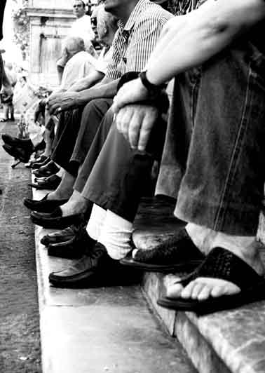 Buono il punto di ripresa e l'idea dell' "infilata" di persone sedute sul gradino, ma la decapitazione delle stesse mi sembra una forzatura compositiva che toglie un sacco di potenzialita' narrativa alla foto.