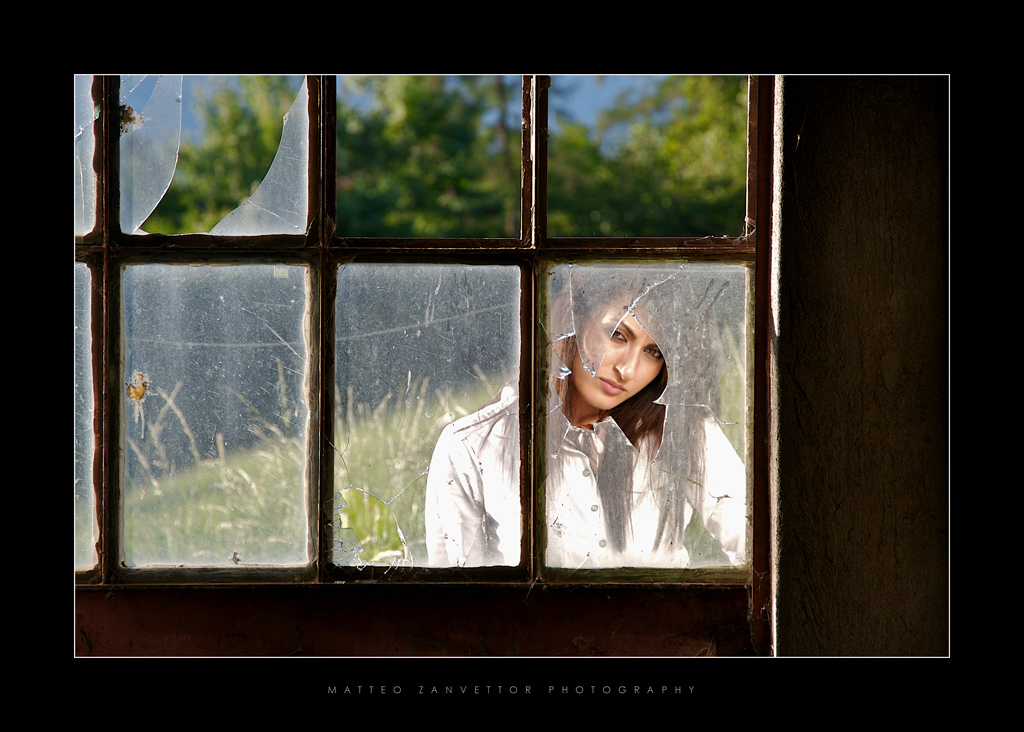La location era un vecchio garage/deposito in una casa di montagna, io ero all'interno e la modella all'esterno, illuminata da sole + pannello riflettente. Per il vetro non so cosa dirti, essendo molto sporco ha dato questo effetto, a me non dispiace sinceramente.