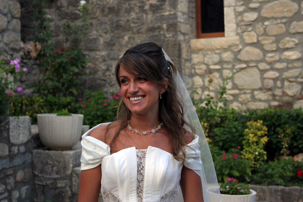 A me questa foto non piace, in particolare il soggetto centrale è fastidioso, il vestito è esposto bene ma il viso è sottoesposto. Inoltre come già osservato il taglio non da la giusta importanza al soggetto e la stessa è mortificata da uno sfocato insufficiente. In questo caso io mi sarei avvicinato di più (ma forse bastava la sola inquadratura verticale), avrei scelto un'inquadratura verticale e avrei posto la sposa sulla destra, inoltre avrei scelto un'apertura opportuna per ottenere il giusto sfocato.