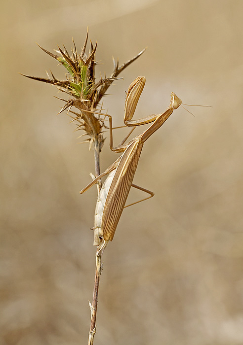 Ottimamente ripresa questa mantide che sembra essere titubante nell'incedere su quel ramo irto e spinoso.