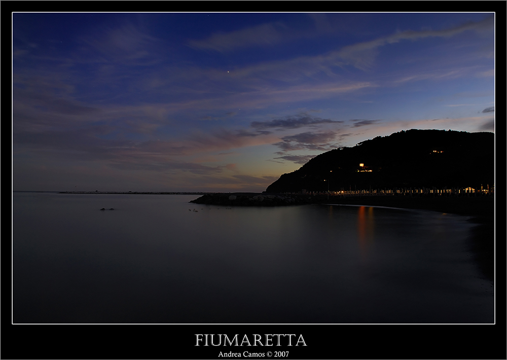alla serenità del mare e del cielo al crepuscolo, si contrappone la massa scura del promontorio, e con le sue luci che ci riporta al nostro mondo.