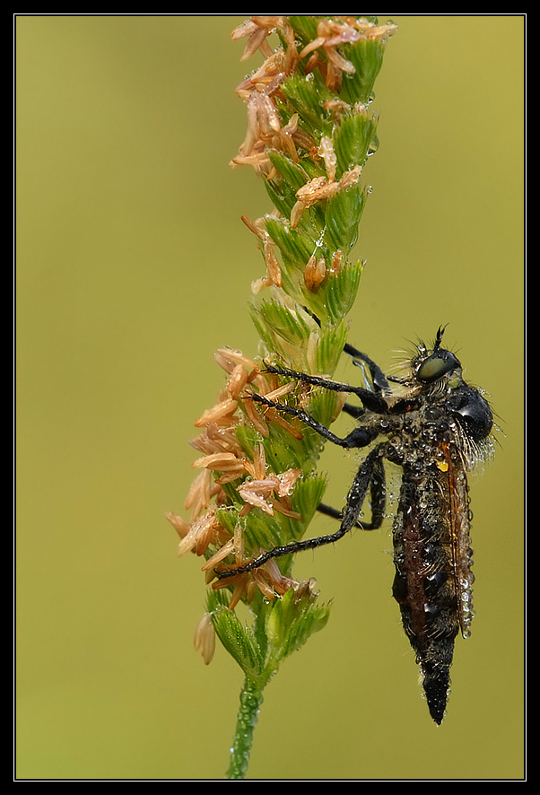 1° trovare l'asilide - 2° trovarlo su un fiore così bello - 3° fotografarlo nitidissimo ancorchè abbia le gocce di rugiada