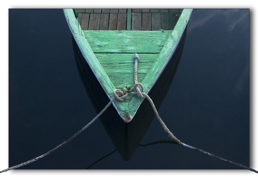 Le geometrie e simmetrie rigorose, ben studiate, sono attenuate dai colori pastello morbidi e ben contrastati con il mare che sembra uno specchio. Le corde che escono dall'inquadratura, poi, sono una chicca che danno la possibilità allo spettatore di "liberare" la barca, di portarla a sè.