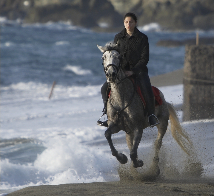 Da sogno o da film una galoppata al mare con la schiuma delle onde.