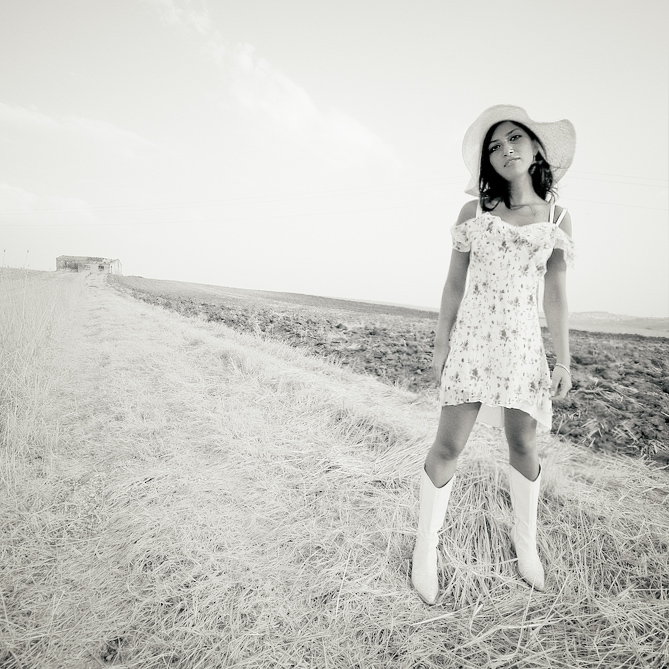 Mi piace moltissimo la composizione, con la modella nel "terzo" verticale di destra e la casa in fondo, che compensa la sua posizione.