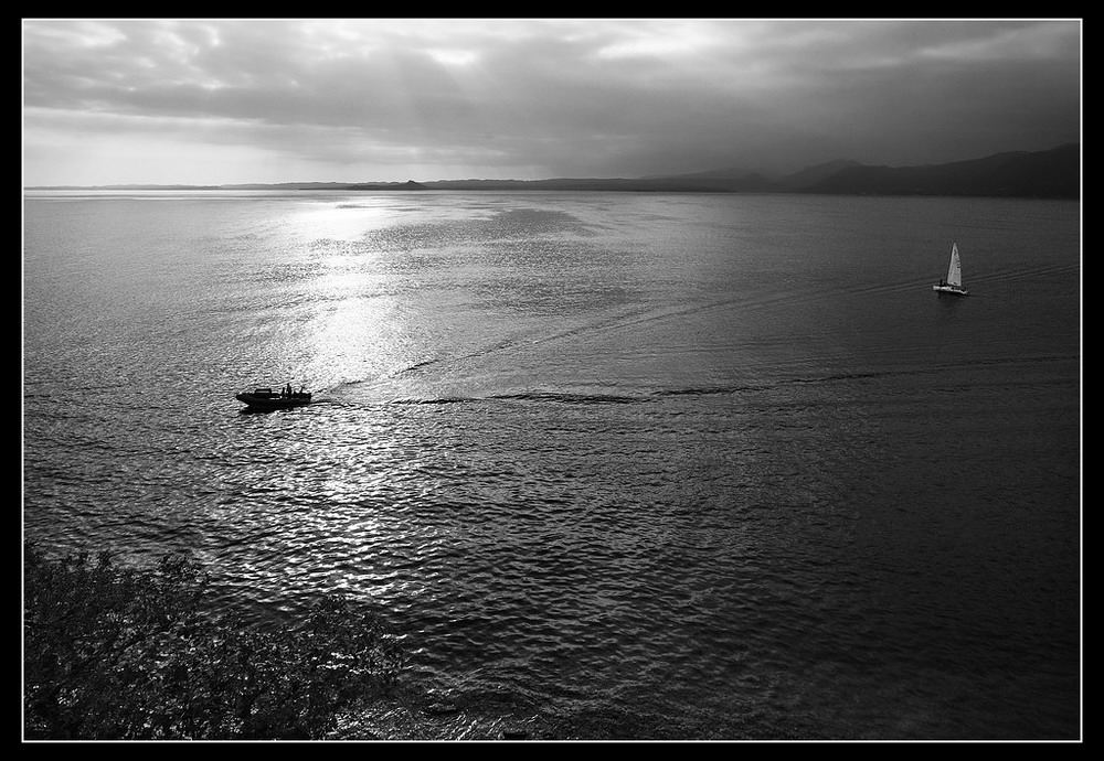 Un bel b/n.Molto interessante la scia della barca a motore che sembra non incidere sulla scia della barca a vela,anzi sembra quasi un invito a seguirla.