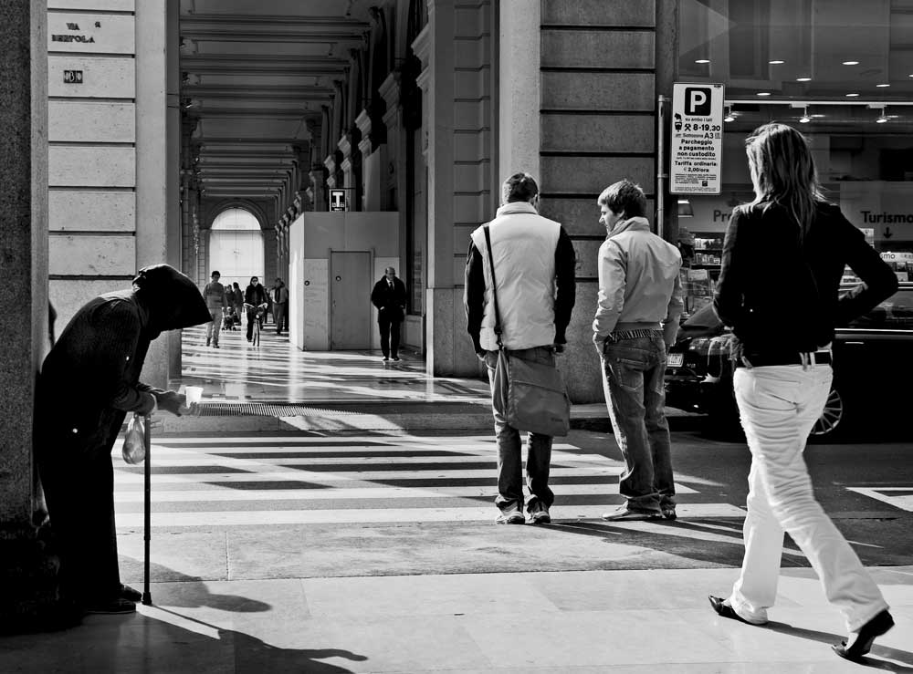 Per evitare di inquinare inutilmente il topic, posso dire che la scelta del B&N nella street è in molti casi legata all'esigenza di ridurre gli elementi di disturbo che in strada non mancano e che con il colore si enfatizzano ... Prendiamo questo caso ... se per esempio i vestiti della donna fossero stati rossi e neri, la percezione della scena sarebbe stata differente, lo sguardo si sarebbe soffermato su di lei, trascurando il resto ... Altro motivo per scegliere il B&N è che alcuni motivi narrativi tipici della street .. per esempio, l'accoppiamento di forme tra umani ed elementi urbani trae giovamento dal tratto monocromatico. Si dice che la foto deve essere pensata prevenitvamente in BN e concordo con questa affermazione alcune foto non funzionano a colori, altre non funzionano in BN ... tutto è legato a cosa si vuol dire e a come il colore o il BN influiscono sulla percezione di quello che si vuol dire.