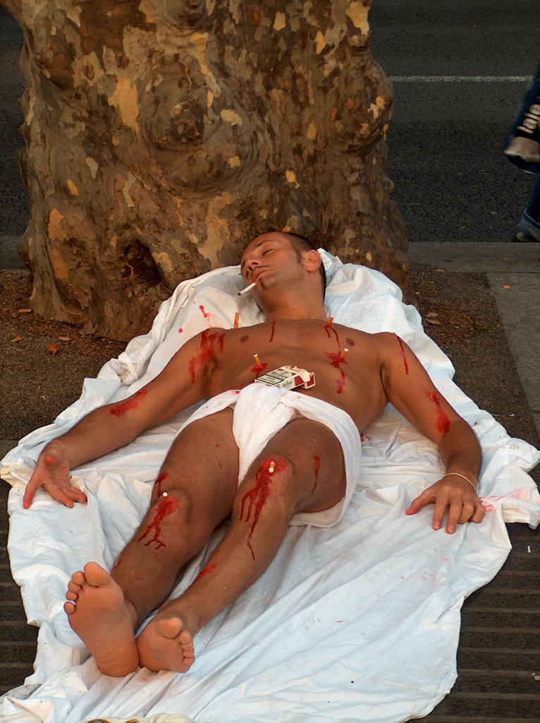 Gran bella immagine, costruita con ingegno, molto surreale e ben realizzata... stupende le sigarette conficcate nel corpo, dal quale emergono solo filtri simili a impugnature di coltelli e col lenzuolo candidato a trasformarsi in tetro sudario!