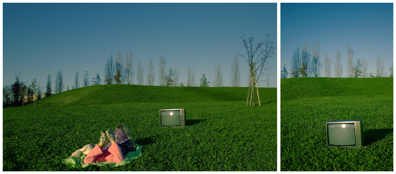 Alla fine trovo che il problema stia in una concettosità eccessiva e pertanto non efficace; per esempio: i televisori sono spenti, non tutte le persone presenti nelle foto sembrano coinvolte dal potere di fascinazione dello schermo e quindi non si capisce cosa noi che guardiamo le tue foto dobbiamo pensare; la suddivisione in dittico non sempre allude alla stessa cosa; in 5 immagini su 6 compare il televisore solo, in alcune anche altro e questo induce confusione interpretativa sulla scelta della partizione da te operata. 2, 4, 5 sono le più penalizzate da scarsa efficacia comunicativa. Sono troppi i perché senza risposta che si affollano in chi guarda, se guarda. Per esempio, nella 4 è istintivo operare un raccordo sulle calzature, ma sfugge la ragione per cui tale raccordo s'ha da fare. Infine, un bel lavoro critico sulla Tv secondo me oggi è superato. Andrebbe fatto sul PC.