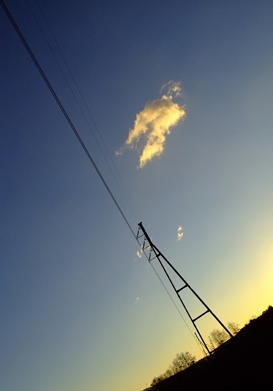 La nuovola sembra come riuscchiata, attratta dalla corrente dei fili elettrici. (simbologia).