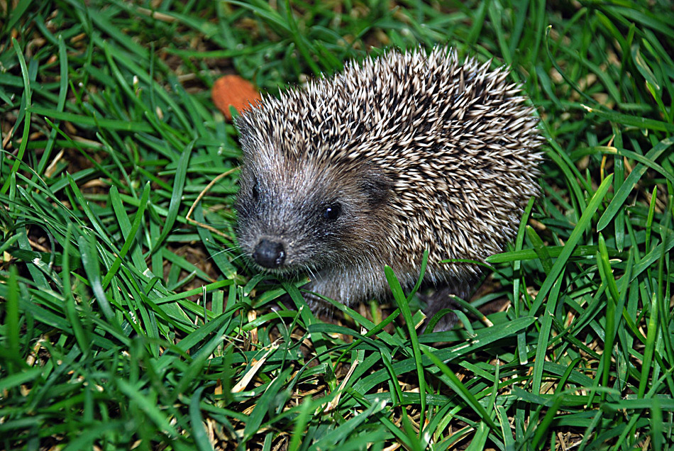 Quanto al ristorante, che gli davi da mangiare? Quello che vedo nell'erba mi sembra tanto una carota, e in tal caso, dopo aver fatto finta di gradire per una settimana per puro galateo, alla fine se l'è squagliata. Da buon insettivoro scambiato per roditore... (e che, sono forse un criceto ???) Pare che gradiscano i croccantini per gatti (quelli piccoli per gattini), i pezzettini di carne, e - penso - le scatolette da gatti. Lombrichi chiocciole e insetti sì, ma mica si va al ristorante per mangiare le solite cose di tutti i giorni ...