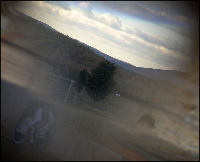 Guardavo la foto e pensavo al modo che hai di intraprendere cammini quantomeno diversi, di come ti poni libero davanti alle idee, di quanto coraggio ci voglia, a volte, per fare. E per fare in modo autonomo..mischi scarpe blu a lacci bianchi (come di chi torna da un viaggio), a quello che vedi fuori dalla finestra di casa tua..che a te sembrerà ormai banale, ma che riguarda una bella spianata e le montagne all'orizzonte..