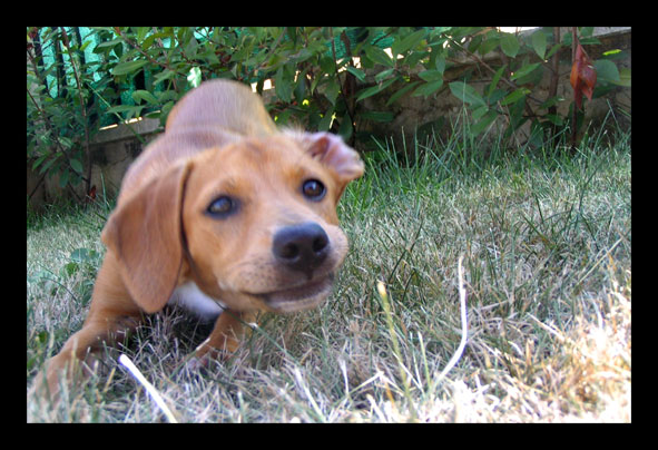 ma che simpatica!!!! Mi viene voglia di stropicciarla!! Mi dispiace solo che l'erba in basso a dx è bruciata, il cane è appene appena mosso e la foto è troppo piccola.