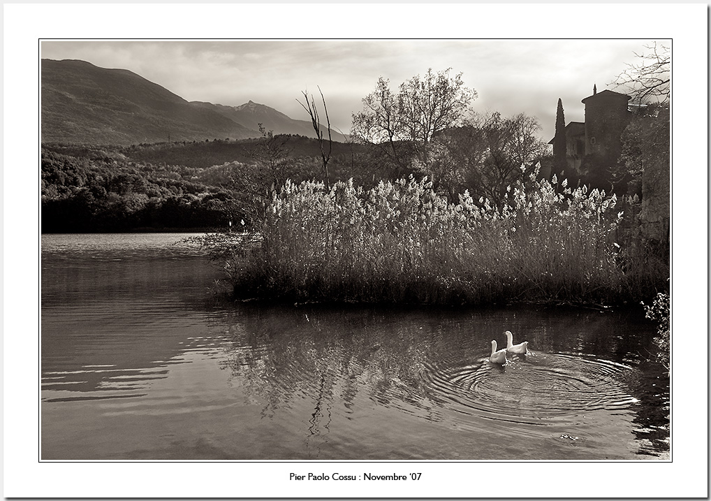 Ancora una piacevolissima immagine, resa preziosa dal grafismo della bassa vegetazione e dalle due oche che nuotano, disegnando cerchi nell'acqua.