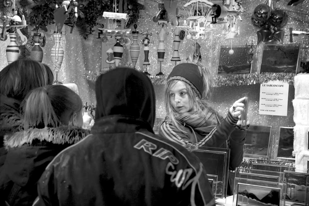 | Bello l'attimo colto e l'espressione della venditrice. Forse un po' ingombrante la figura in primo piano e leggermente fastidioso il riverbero sul colletto e i capelli della ragazza bionda di spalle. |