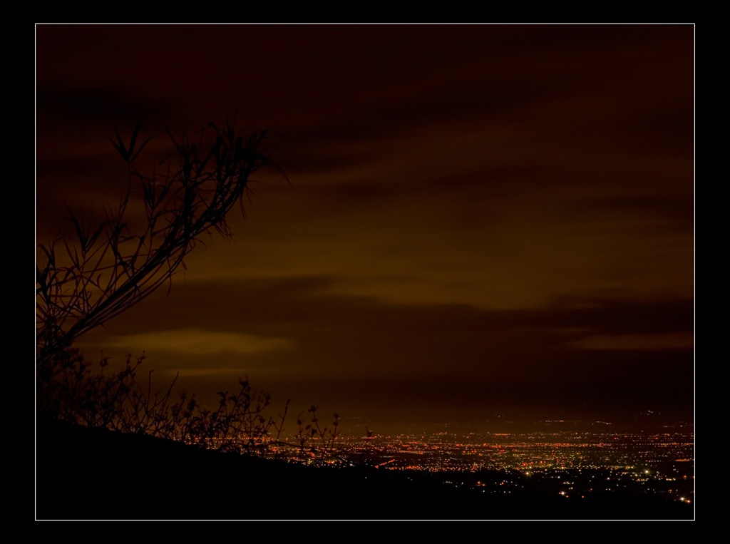 bella davvero, la silouette disegnata dalla vegetazione in primo piano fa da trama al paesaggio fatto di piccole luci gialo rosse che sembrano un braciere, la luminiscenza della citta' rende l'effetto di calore che si propaga. Il cielo buio e cupo è il tocco finale a questo bello scatto ed originalissima idea.