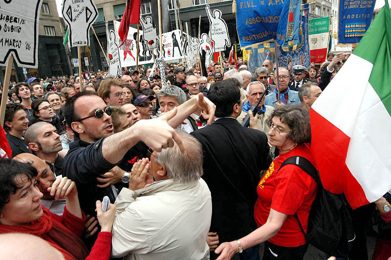 | In passato la foto l'ho presentata con un altro titolo raccontando la cronaca dell'episodio. Questo ha generato spesso una discussione politica che trascendeva dal significato fotografico che le avrei voluto dare. Nel riguardare l'immagine a distanza di tempo, oggi vi colgo soltanto il "dramma" di questi due gesti: a pace e la volontà contrapposte alla stupidità della violenza. |