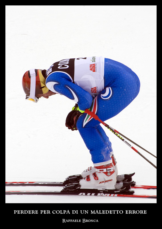 | Sono sincero: la foto mi dice poco. Se non ci fosse in titolo potrebbe anche sembrare che si sia fatto male a una mano o al ginocchio. Ergo, se già lo scatto fa venire questo dubbio a un osservatore vuol dire che il messaggio trasmesso non è chiaro. Non mi fanno impazzire, poi, gli sci tagliati da entrambe le parti... |