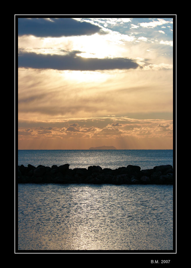 Una alternativa è il taglio quadrato, che toglie ogni traccia delle bruciatura, lasciando solo una visone pacificata ma differente, forse, dalla tua visione.... Inoltre ho corretto leggermente il riflesso luminoso che cade in mare in primo piano, un po' troppo tunnel, un po' scolastico insomma... ti posto il mio esempio mutilato.... ma, se ti dispiace fammelo sapere e lo tolgo subito....