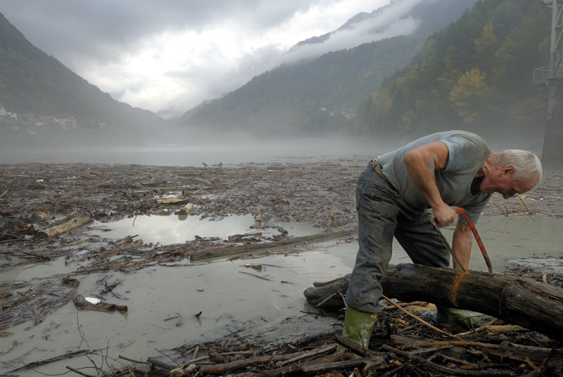 Dopo la piena sulle rive del lago artificiale si recupera il legname portato dal fiume.