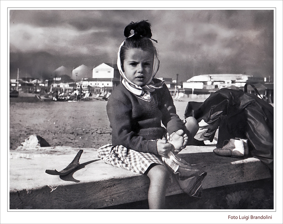 ma a me piace moltissimo anche tutto quello che gli sta intorno, quello che si intravede sullo sfondo, quelle case con la facciata bianca, le ultime sdraio sulla spiaggia deserta, e poi le scarpine di cuoio bianco, il pezzo di legno che la bambina ha raccolto sulla battigia per giocare che proietta un'ombra curva sul muretto, il fazzoletto che si agita al vento, elementi che tutti insieme raccontano in maniera poetica una giornata di inizio autunno