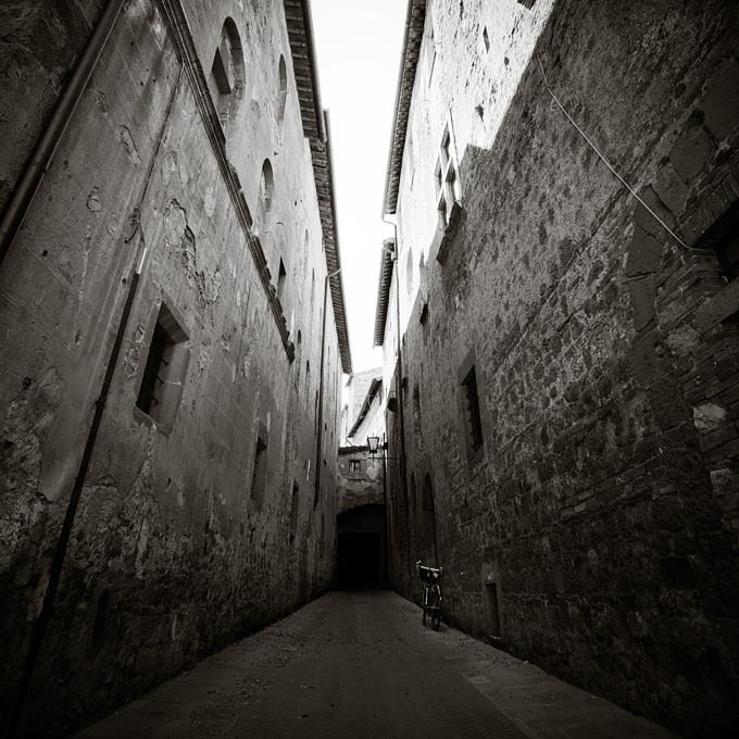 Molto bella immagine con i casamenti incombenti sulla strada e il riflesso vivido del manubrio e dei parafanghi della bicicletta. L'avrei vista forse meglio nella categoria paesaggi piuttosto che street