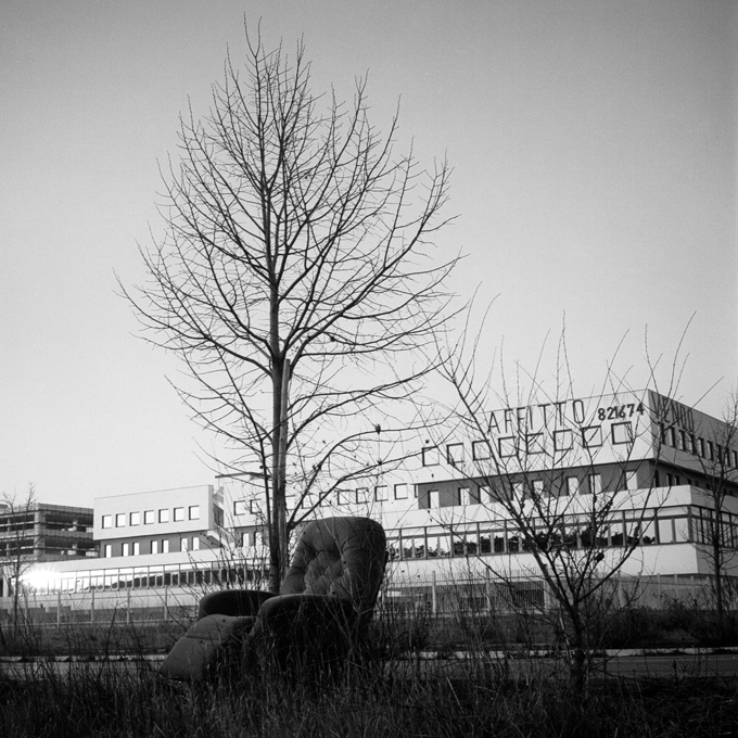 Anche l'edificio sullo sfondo, pur contestualizzando (area industriale), ruba un po' la scena alla poltrona e l'occhio è inevitabilmente attirato dalla scritta AFFITTO...