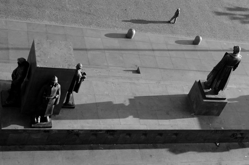 Mi spiego: le linee del monumento mi paiono un po' caotiche, senza una fuga vera e propria o un allineamento (il bordo in basso del monumento è stortino e forse avrei inquadrato un po' più in alto); l'uomo mi pare in una posizione un po' troppo marginale, troppo vicino al bordo, in più cammina verso un punto morto dell'immagine (l'angolo in alto a sx); il bn è poco incisivo, un po' grigino (P&B a colori non sarebbe cambiato moltissimo, visto che il monumento è già grigio ).