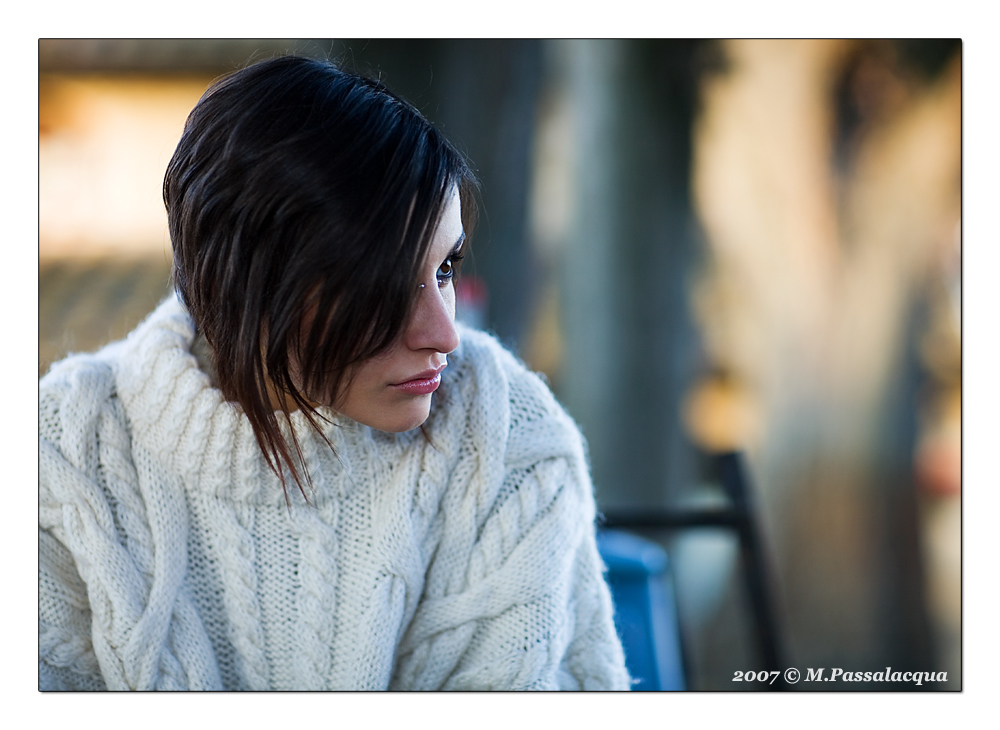 Questa foto è uno spettacolo: la contrapposizione tra la nitidezza quasi tagliente del viso della modella e lo sfocato del maglione, prima ancora che dello sfondo mi fa impazzire. Ammirevole: da guardare, guardare, guardare e sperare di imparare.