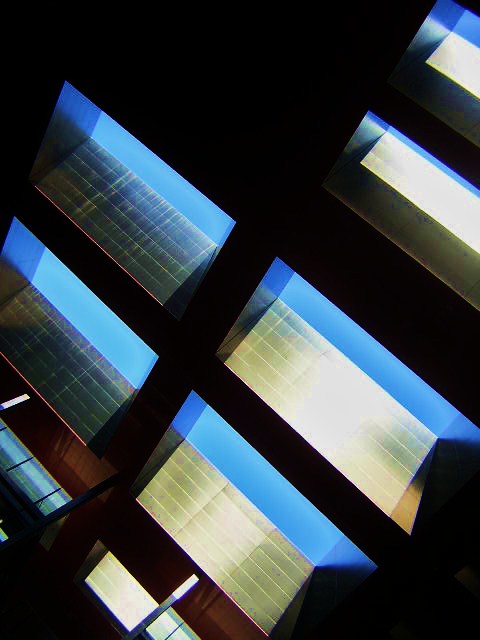 Un bel grafismo o gioco di linee anche sul pavimento, dove si irradiano delle ombre a forma di triangolo.. mente il blu del cielo si ripete in questi rettangoli.. bella la tinta metallica, e soprattutto quelle sfumature della zona alta, graffiate, strisciate..