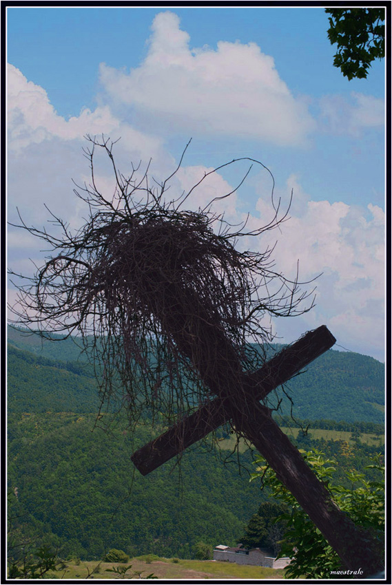 Andrea,Biagio,Grazie per la visita ed i commenti.Questa è una foto che ho fatto quest'estate,in un paese dell'umbria,di cui non ricordo neppure il nome,il cimitero sotto,in effetti ha rischiato il clone,ma poi ho preferito lasciare le cose cosi come erano,l'unico caduto è stato un palo della luce.Ho invece cercato,di cambiare il contrasto dello sfondo,ma essendo stata sbagliata l'esposizione non ho fatto un gran che.Perchè lo mandata allora? Perchè mi aveva colpito,questa croce in bilico invasa dai rampicanti ,in un paesino terremotato,ma che nonostante tutto,resisteva e continuava a portare avanti il messaggio di fede di chi l'aveva piantata,e con il titolo ho cercato di trasmettere tutto ciò.
