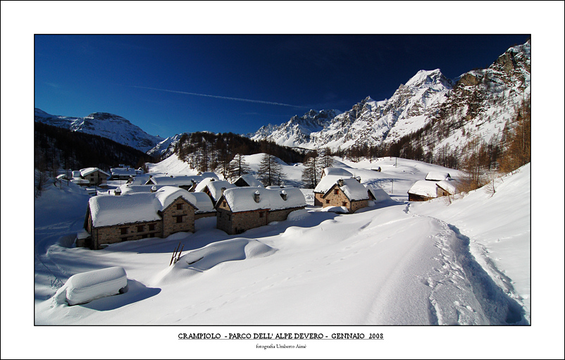 soffice, armoniosa, con quelle ombre lunghe e controllate, quel bianco frenato... da bucato ben riuscito di madre natura . Sarà che è così facile scivolare nella banalità della montagna e dall'aria tersa... ma hai avuto il coraggio della normalità per questo paesaggio silenzioso, per queste casette di bambola.... e la freccia bianca in cielo ti ha premiato....
