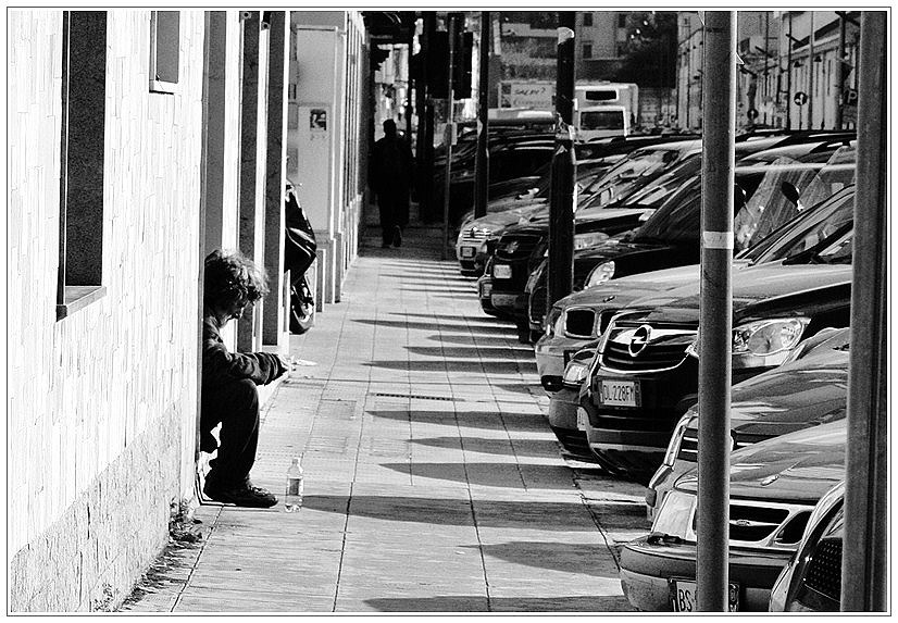 bella street impreziosita dalle ombre lunghe in parallelo delle auto:sembrano lance ke arretrano l'uomo seduto e lo limitano nel suo spazio ristretto...