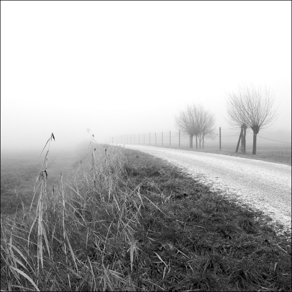 Bellissima, si allontana dalle ormai conosciute e un po' inflazionate foto di un albero in mezzo alla nebbia o di una strada che finisce nella stessa grazie a due fattori: la presenza di un primo piano nitido che aumenta la profondità di campo e dallo spostamento della strada sul lato destro della composizione. Gli alberi sono presenti ma rivestono a mio avviso di ruolo di "spalla" nei confronti della strada.