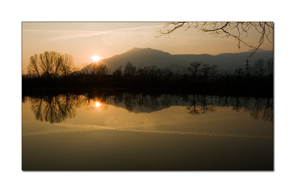 bellissime le tonalita' e la luce di questo scatto e ottima la compo con l'inclusione dei rami dall'alto e il sole che fa capolino dalla montagna. Ottimamente gestito il controluce