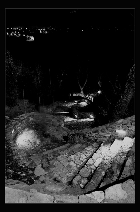 Immagino questa stradina tortuosa che scende e poi finisce nel buio. Ma finisce solo apparentemente poiche' le luci che si intravedono in fondo ci fa capire che probabilmente quella strada non finisce li nel buio ma ci va oltre per arrivare alle luci.....