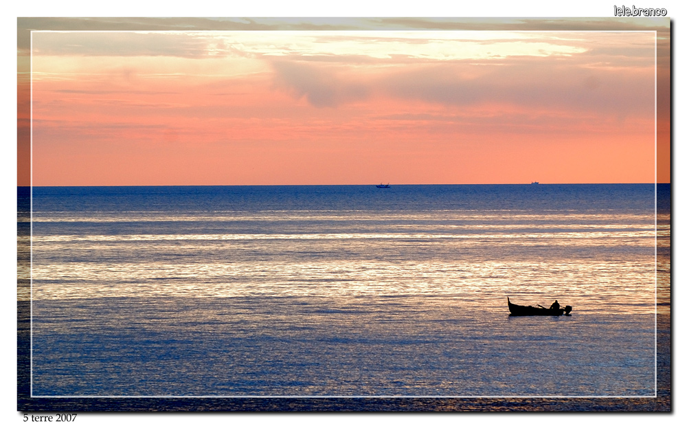 Colori tenui e delicati, molto belli i riflressi del mare, l'azzurro che contorna lo specchio che riflette il tramonto, ottima l'immagine sulla barca.