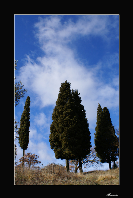 Andrea,Luciano,Mauri,grazie per la visita ed i commenti.La foto è stata fatta "d'istinto"come mi sono girato,ho guardato in alto,ho visto quei cipressi che sembravano portarmi in cielo,ed ho scattato.