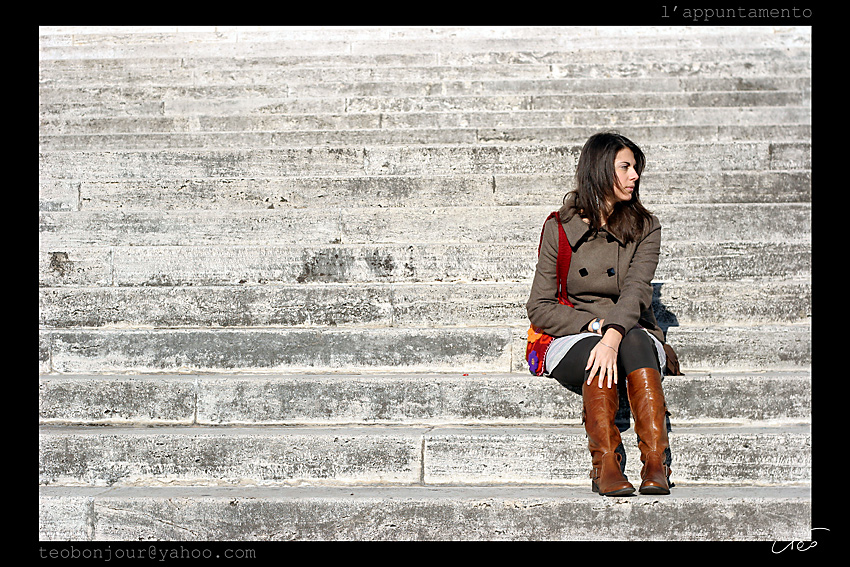 La foto rende molto bene il titolo, con la ragazza che fissa un punto ben preciso, ansiosa di vedere apparire un Lui. Bello il contrasto della scalinata biancastra che fa da scena teatrale,con la macchia di colore della ragazza.Un saluto. Stefano _________________ stefano romano |