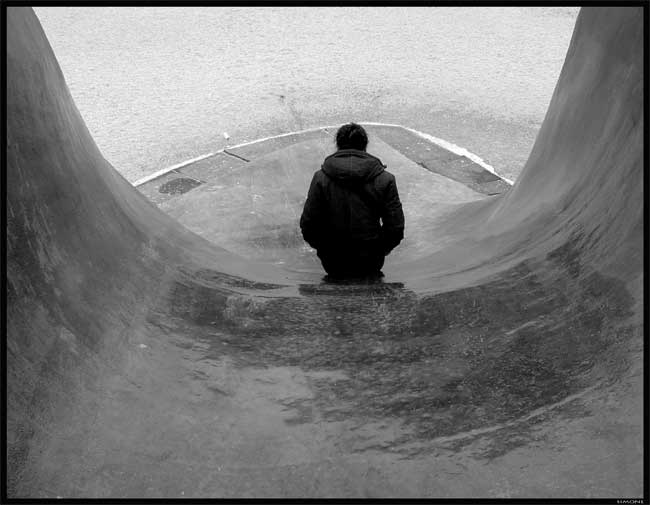 solitaria, di spalle, in quella posa rakkiusa dà un senso di tristezza eppure di fronte all'uscita di questa specie di tunnel, seduta pensosa a ciò ke c'è fuori suggerisce speranza...